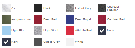 Colors: White, Black, Ash, Athletic Red, Cardinal, Deep Red, Charcoal Heather, Light Blue, Deep Royal, Navy, Light Steel Fatigue, Oxford Grey