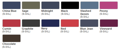 Colors: China Blue, Sage, Midnight, Black, Washed Denim, Peony, Cumin, Graphite, Navy, Red, Blue Jean, Vineyard, Chocolate